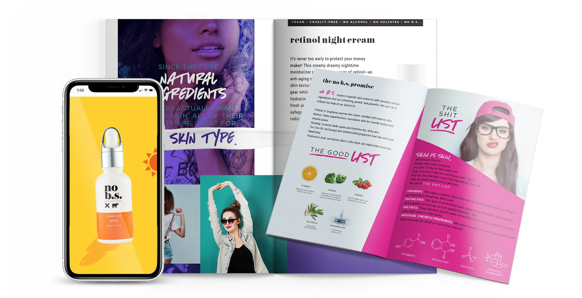 Using vibrant colors and a “not giving a %$&#” attitude sets this beauty brand apart. A colorful, ‘swipe up’ feature was created to direct customers to their landing page. Also, above you’ll find a multi-page booklet used for direct mail marketing.